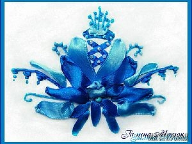 Боковые элементы бутона я вышила "прямыми" стежками голубой лентой (1,7 см).