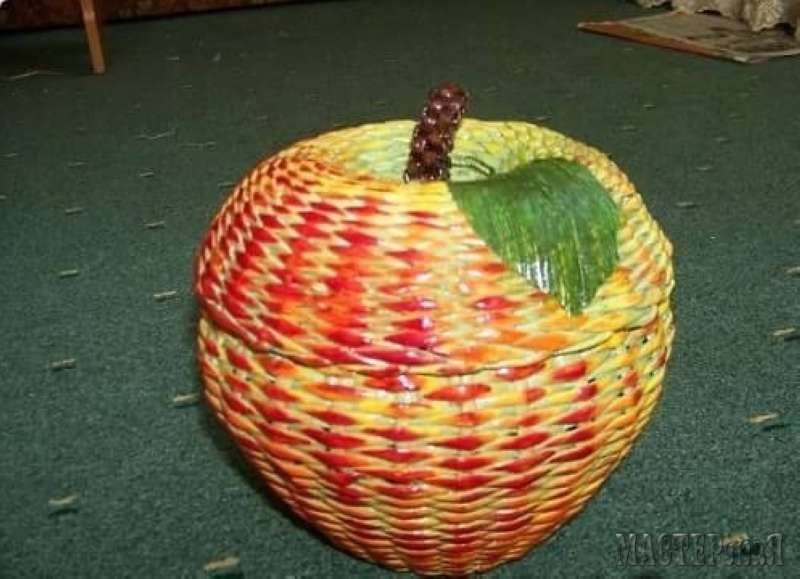 Плетение яблока из газетных трубочек принесет вам массу удовольствия, ведь это так здорово- создавать нужные и красивые вещи из того, что должно было отправиться в мусорную корзину.Данную идею можно применить для празднования Яблочного Спаса. В этом случае яблочки нужно сплести небольшого размера и положить в плетеную корзину. А можно сплести яблоко по-больше в виде корзинки с крышечкой для всяких нужных мелочей.