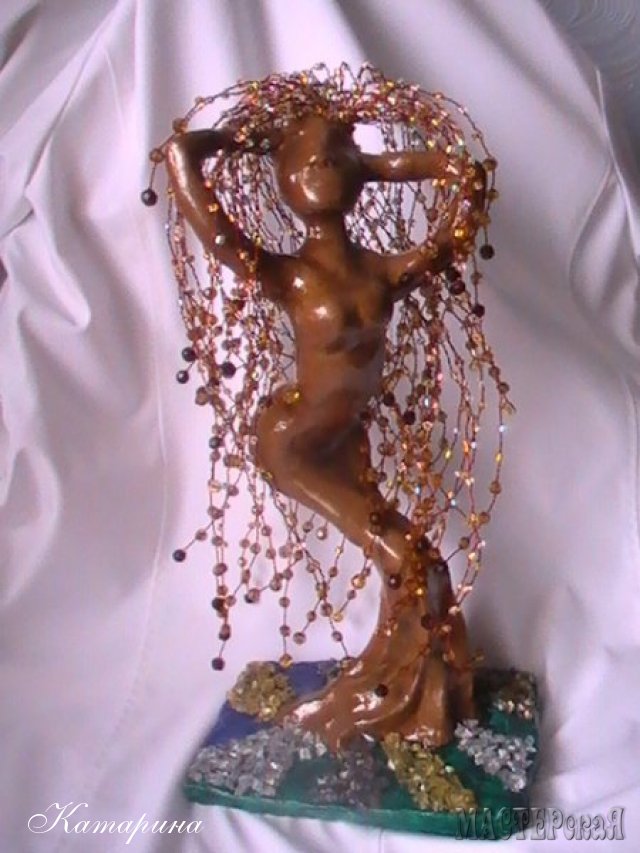 На каркас из проволоки формируем туловище из гипса с добавлением небольшого количества муки. готовую фигурку шлифуем наждачной бумагой и грунтуем клеем ПВА наполовину разбавленного водой. Красим акриловой краской в несколько слоев. Затем лак в 3 слоя.Волосы сплетены из бусин, бисера.