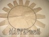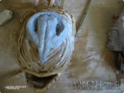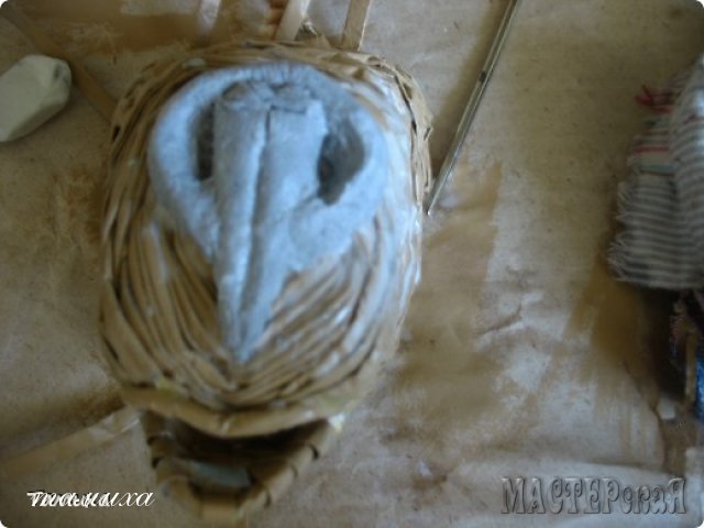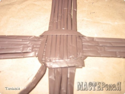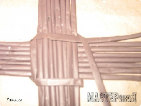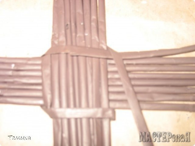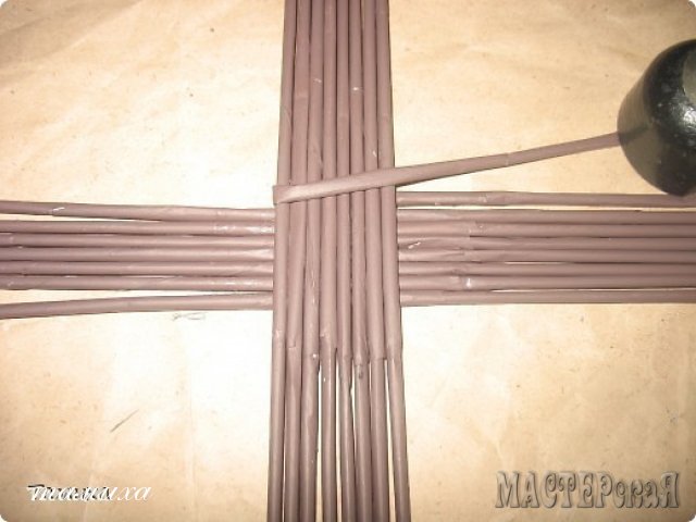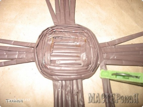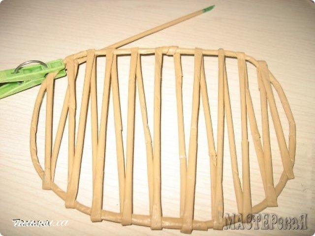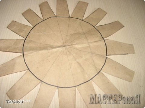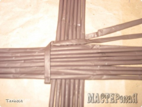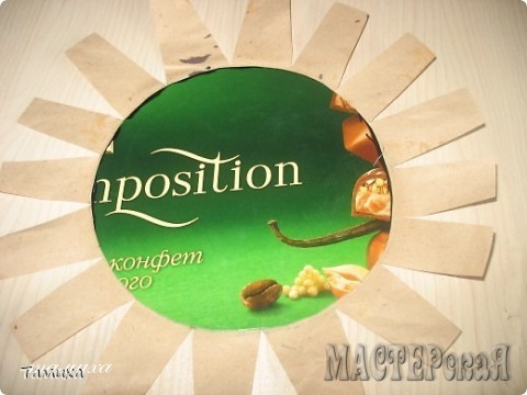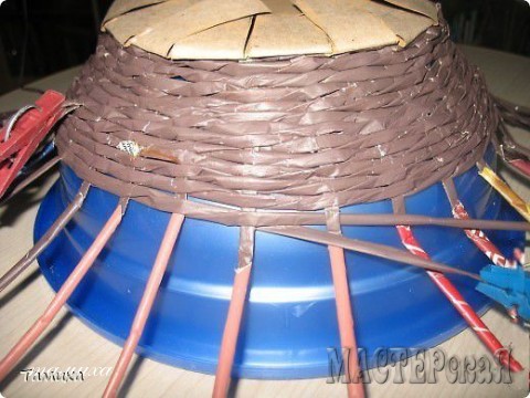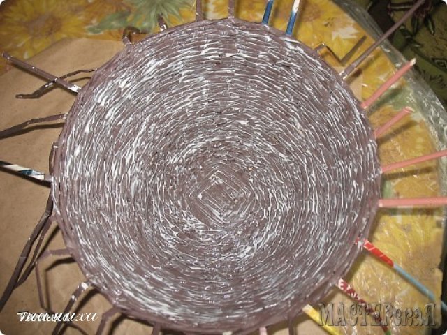По краям я специально оставила отростки трубочек для крепления. А теперь произведем сборку хлебницы. Приготовьте длинный шнурок, один конец оставьте свободным, пришейте, как пришьете голову к туловищу, при этом устанавливайте голову лучиками правильно. Приклейте бумажные лучики во внутрь туловища.Сделайте на очень толстую спицу трубочку. Намажьте клеем места соединения,приклейте трубочку.Высохнет-покрасьте.