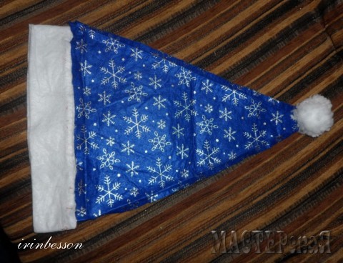 Колпаки были разобраны,(сшиты они из цветной нетканки с аппликацией снежинок) отделила все белые части колпаков, и сами колпаки по одному шву распорола -из них вырезала овалы,под размер шубок (из остатков шапочки),потом из белых частей воротники(для шуб) и отделку шапочек. Т.к. нетканка очень плохо протыкалась крючком,то сначала обшила по овалы (вставив воротник) оверложным швом и затем обвязала двумя рядами "травки", из "травки" же связала пумпончики на шапочки и бороду(как шьются шапочки я думаю все знают) волосы из пучка ниток,который просто вшила в шапочку к Снегурке. Осталось только собрать - заворачиваем бутылку в "шубу" отворачиваем воротник, подпоясываем тесьмой подходящего цвета, надеваем шапочки.... и вот-парочка отправилась на детский праздник!!!